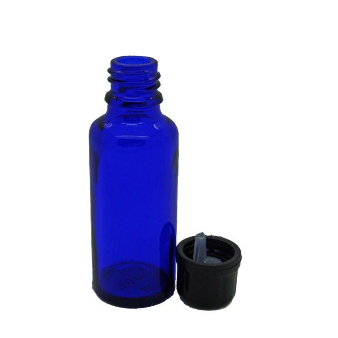 30ml Cobalt Blue Glass Bottle, narrow neck, including black cap and internal dropper.Accessories: White lids to fit this bottle can be bought separately, see 'Inserts & Caps'. Alternatively, for a modern look have a look at our aluminium closures.